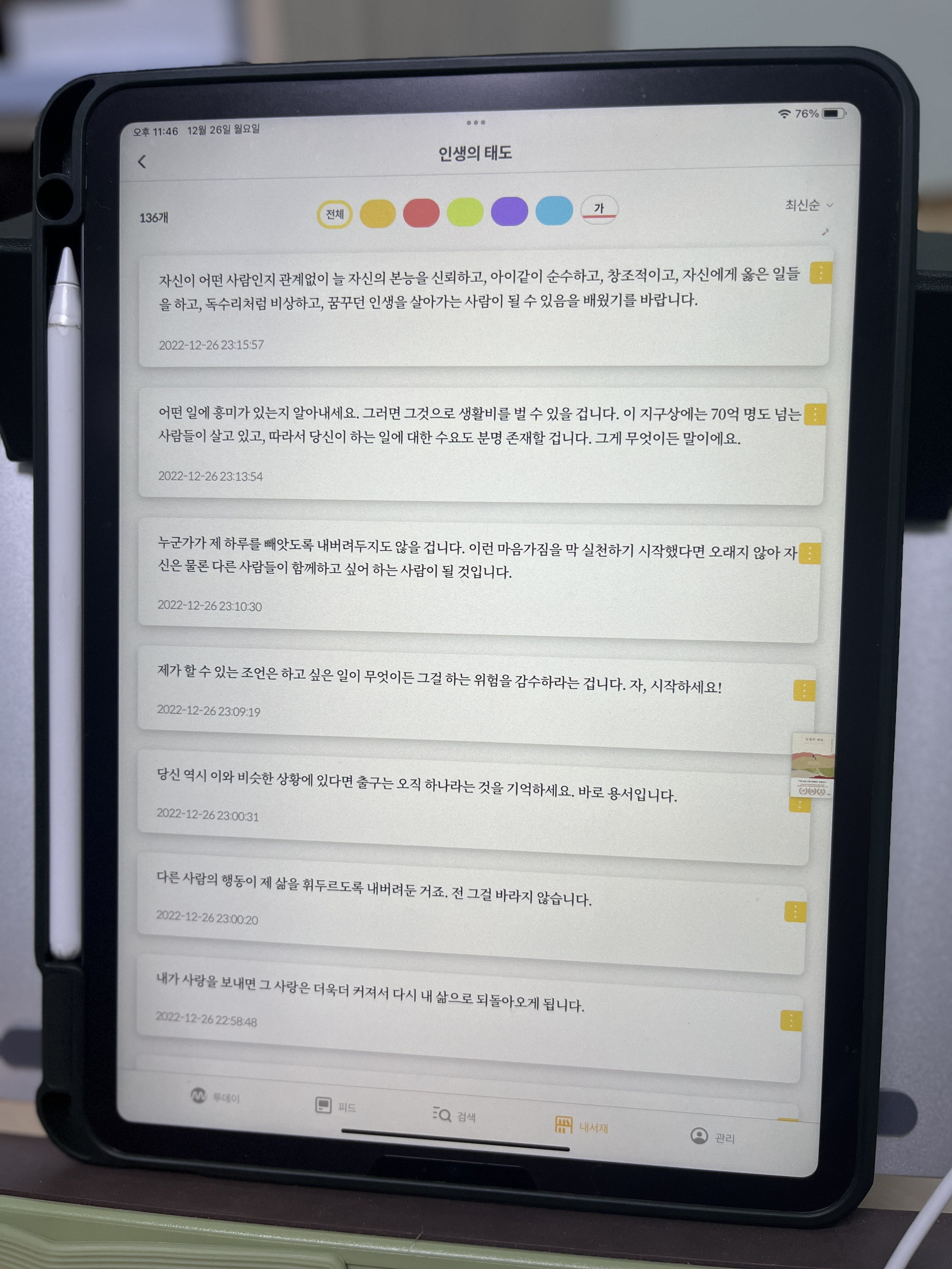 다른 사람이 나에 대해 어떻게 생각하느냐는 나와 관계없다. 자기 자신을 조용히 사랑하면 된다. 나는 보통 다른 사람 눈치를 굉장히 많이 본다. 다른 사람이 어떻게 나를 생각할지 혹시 흠 잡힐 것은 없는지. 내가 대인관계에서 혹시 소외받지는 않는지 가끔 생각한다. 사실은 내가 나를 사랑하는지는 관심이 없었던 것 같다. 이제는 조용히 내 내면을 키워가는 것에 힘을 실어야겠다고 생각했다. 이 책은 너무 밑줄을 많이 그어서 한 줄 한 줄 다시 꺼내보아도 교훈삼을 내용이 정말 많은 책이었다.